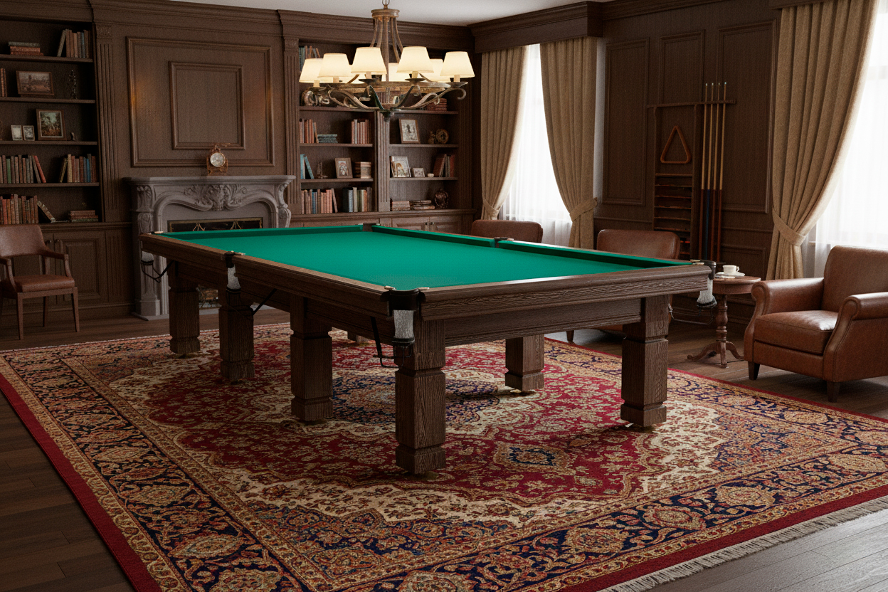 Размер бильярдного стола составляет 12 футов. Модель будет прекрасно смотреться в интерьере загородного дома, создавая теплую и уютную атмосферу.
