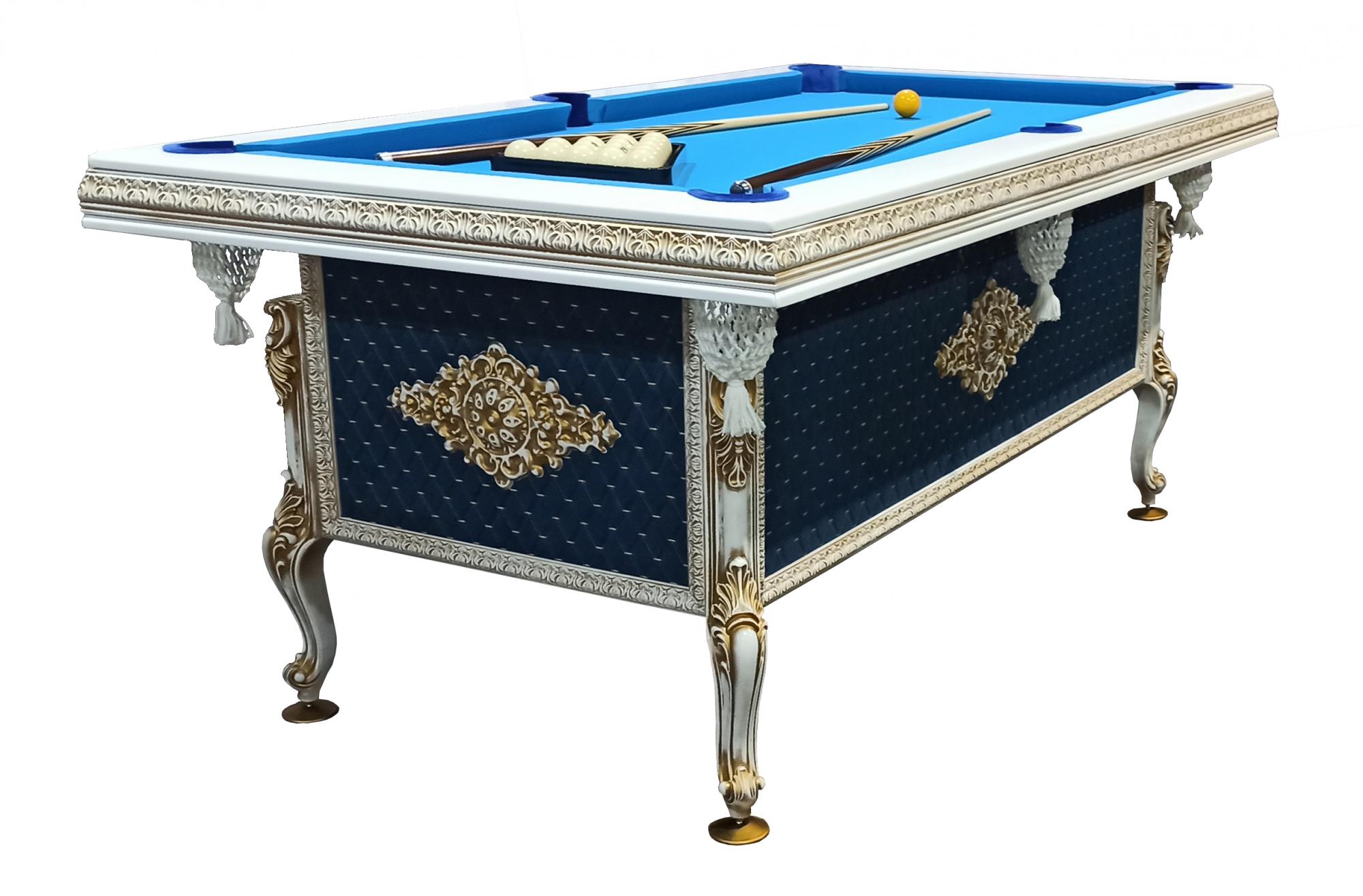 Эта модель выделяется необычным дизайном в стиле ампир. Золотистая патина, боковые панели, обитые изысканным сукном и украшенные оригинальными барельефами, создают по-настоящему торжественный облик. Голубое сукно подчёркивает индивидуальность стола и гармонично завершает его образ.