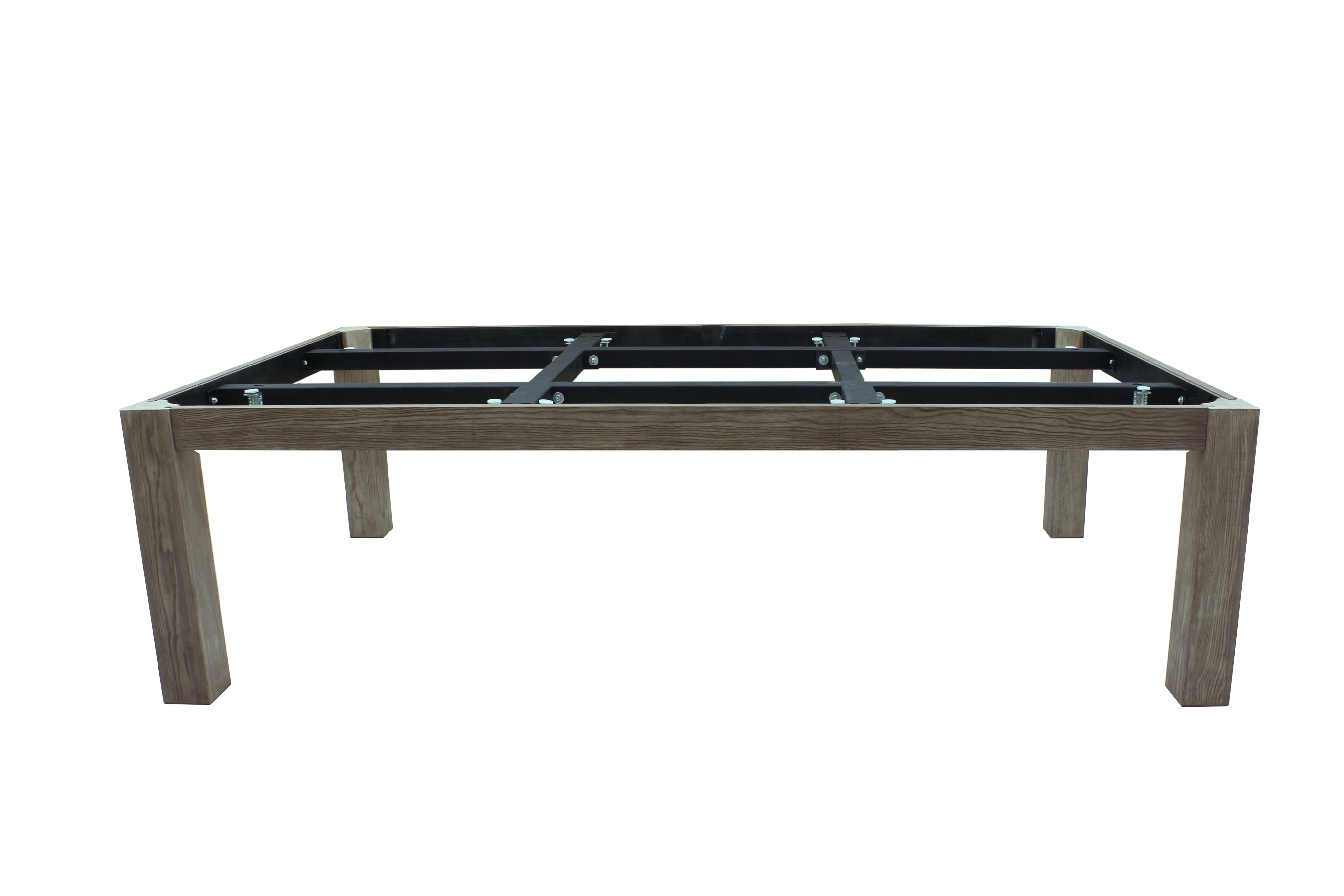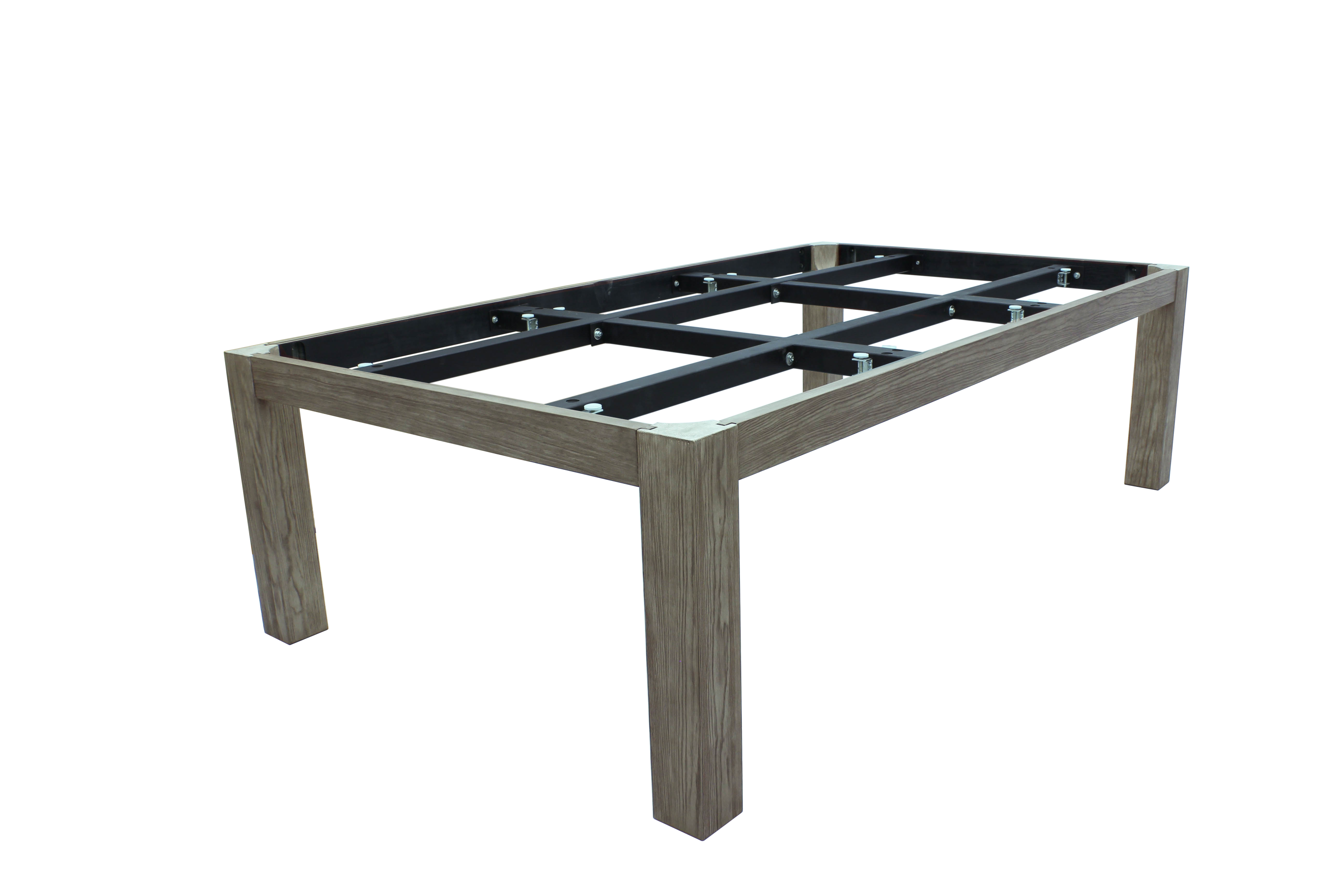 Стол сделан из древесины твердых пород  с металлической рамой.