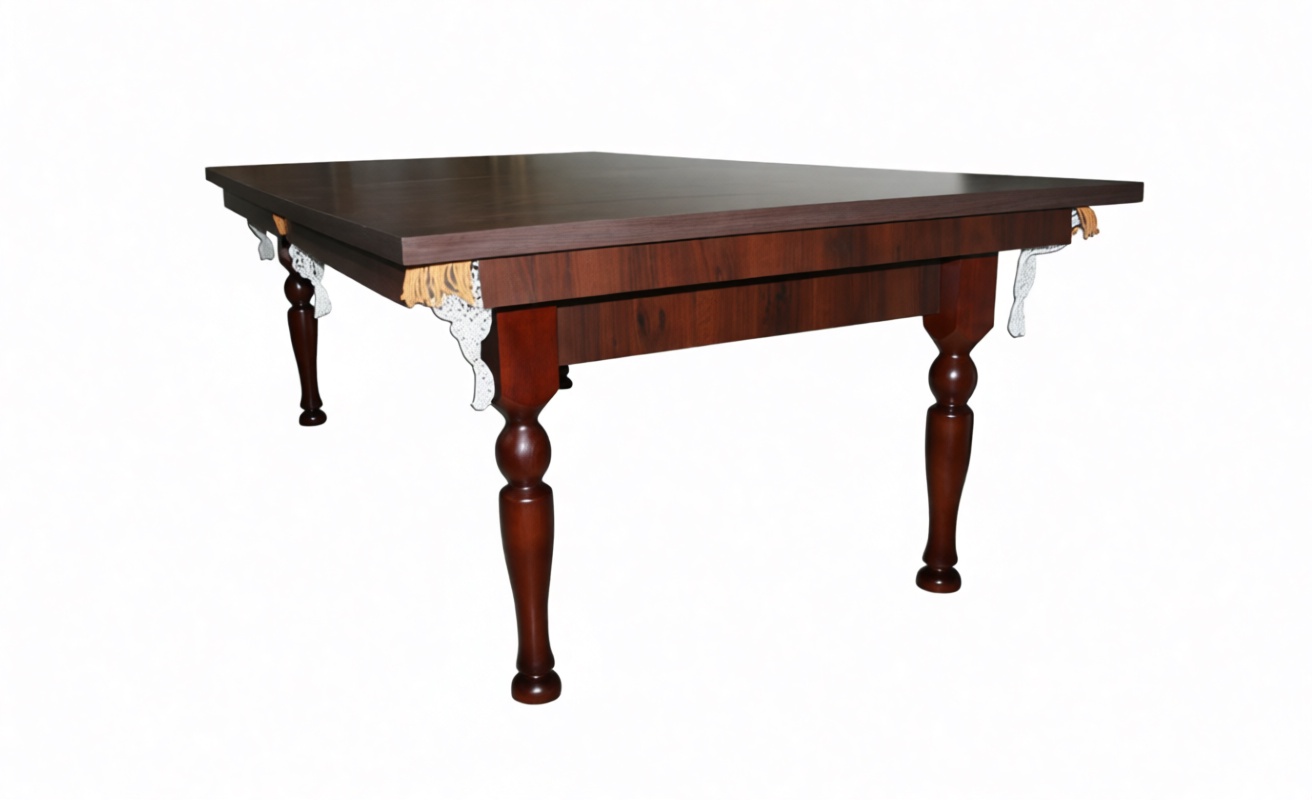 Конструктивные особенности: столешница выполнена из ЛДСП толщиной 16 мм, высота игровой поверхности регулируется от 74 до 78 см. Усиленная рама и надёжные опоры из массива сосны с точеными элементами обеспечивают устойчивость и стабильность во время игры.