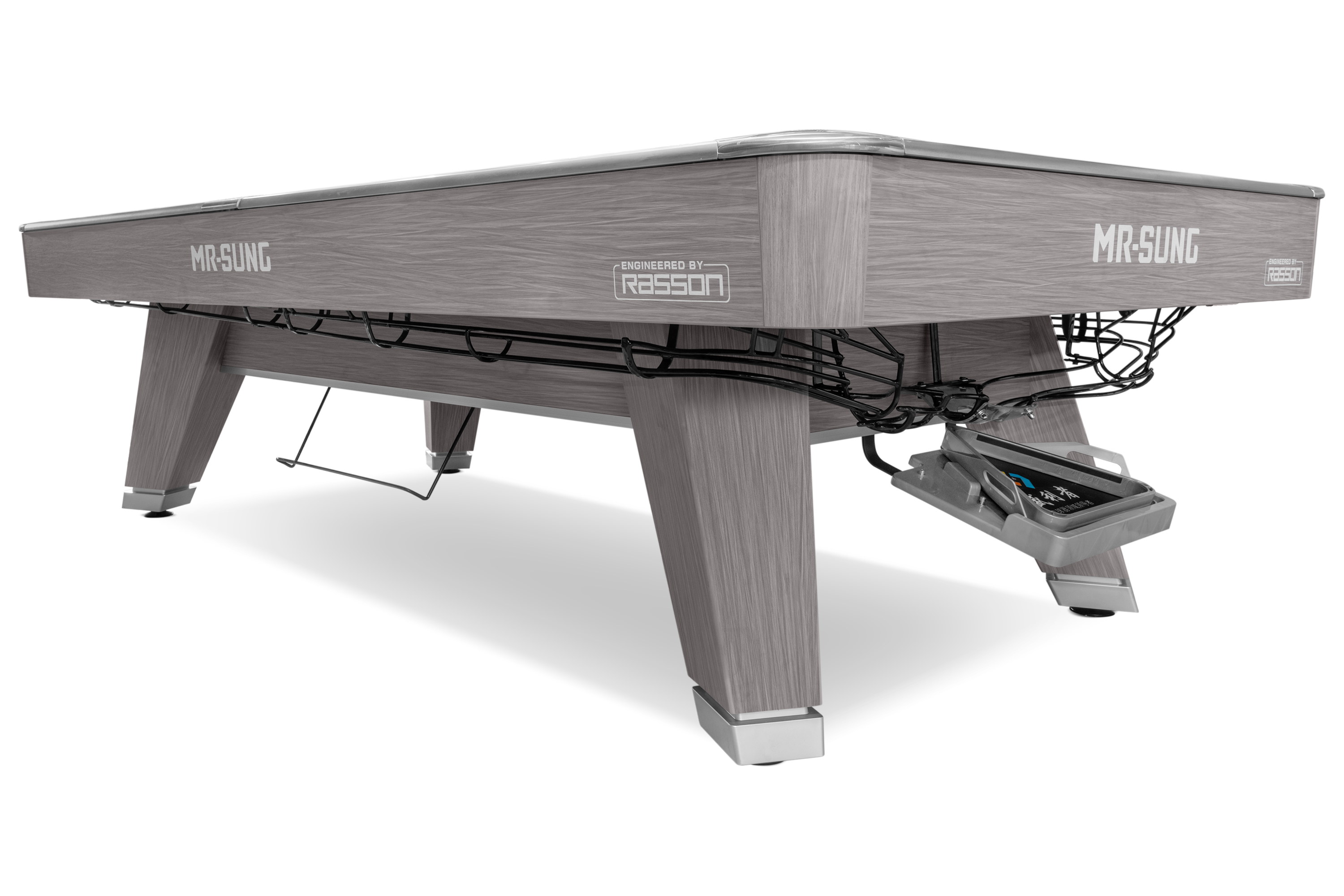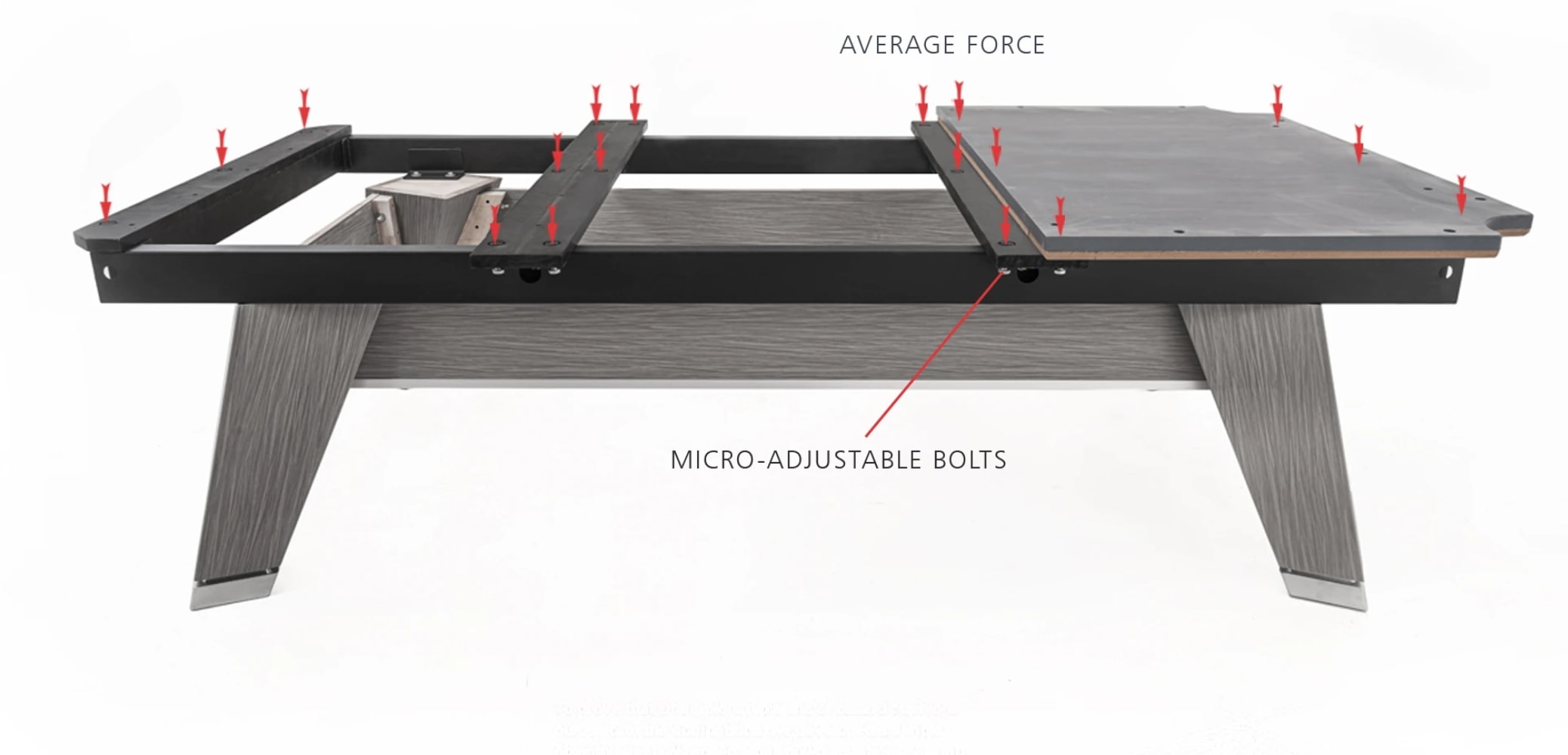 Стол оснащен опорной балкой из стали и дерева. Фирменное выравнивание плиты имеет 18 микрорегулируемых точек для идеально ровной игровой поверхности. Удобная и точная система выравнивания плиты обеспечивает превосходную устойчивость.