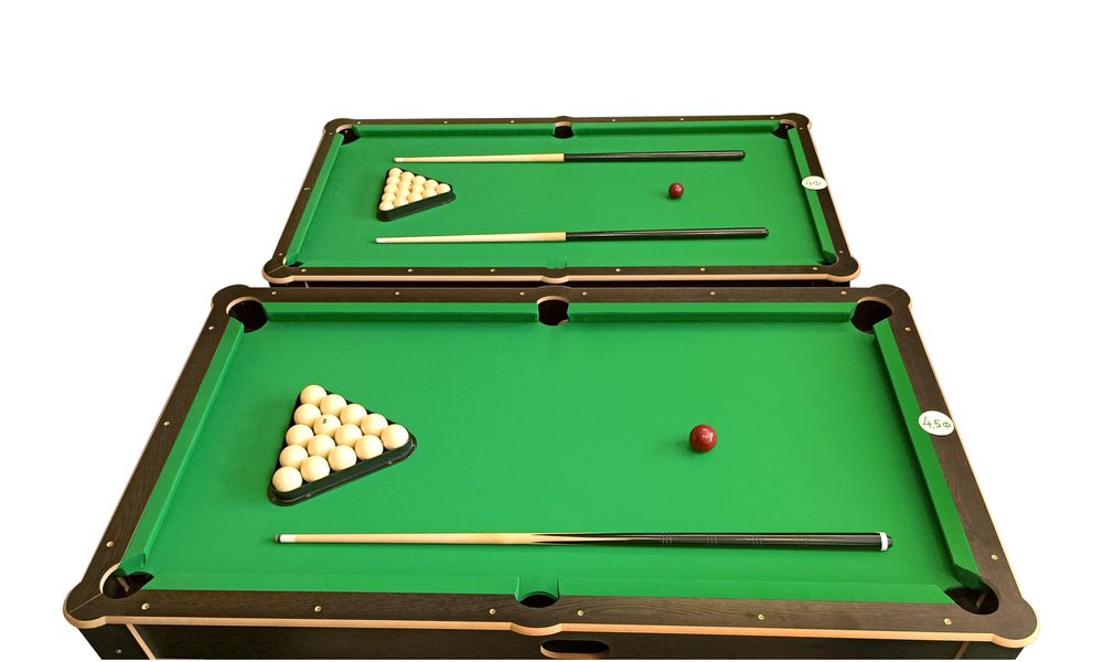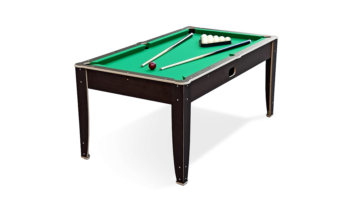 В комплекте уже есть всё необходимое: шары диаметром 38 мм (для пула), треугольник и два кия. Опоры регулируются по высоте от 60 до 72 см.