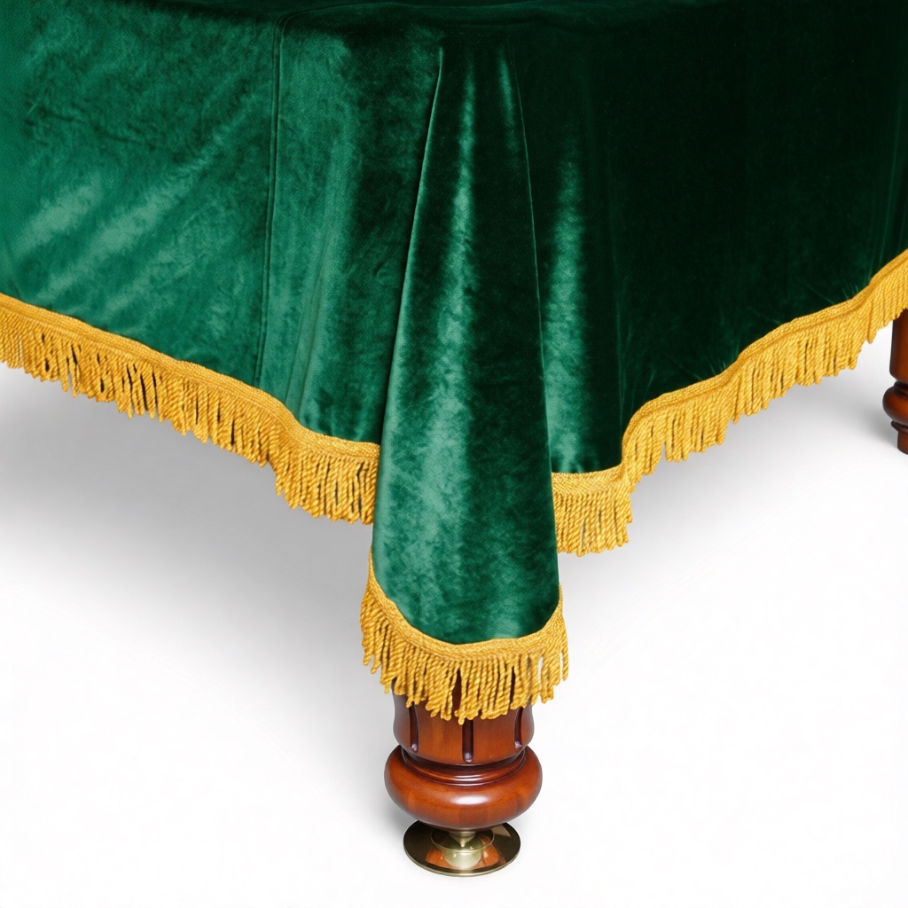Это покрывало из мягкого зелёного бархата, отделанное элегантной жёлтой бахромой, не только украсит бильярдную комнату, но и надёжно защитит стол в перерывах между играми. Оно предохраняет сукно и игровую поверхность от пыли, влаги, яркого солнечного света и случайных царапин.
