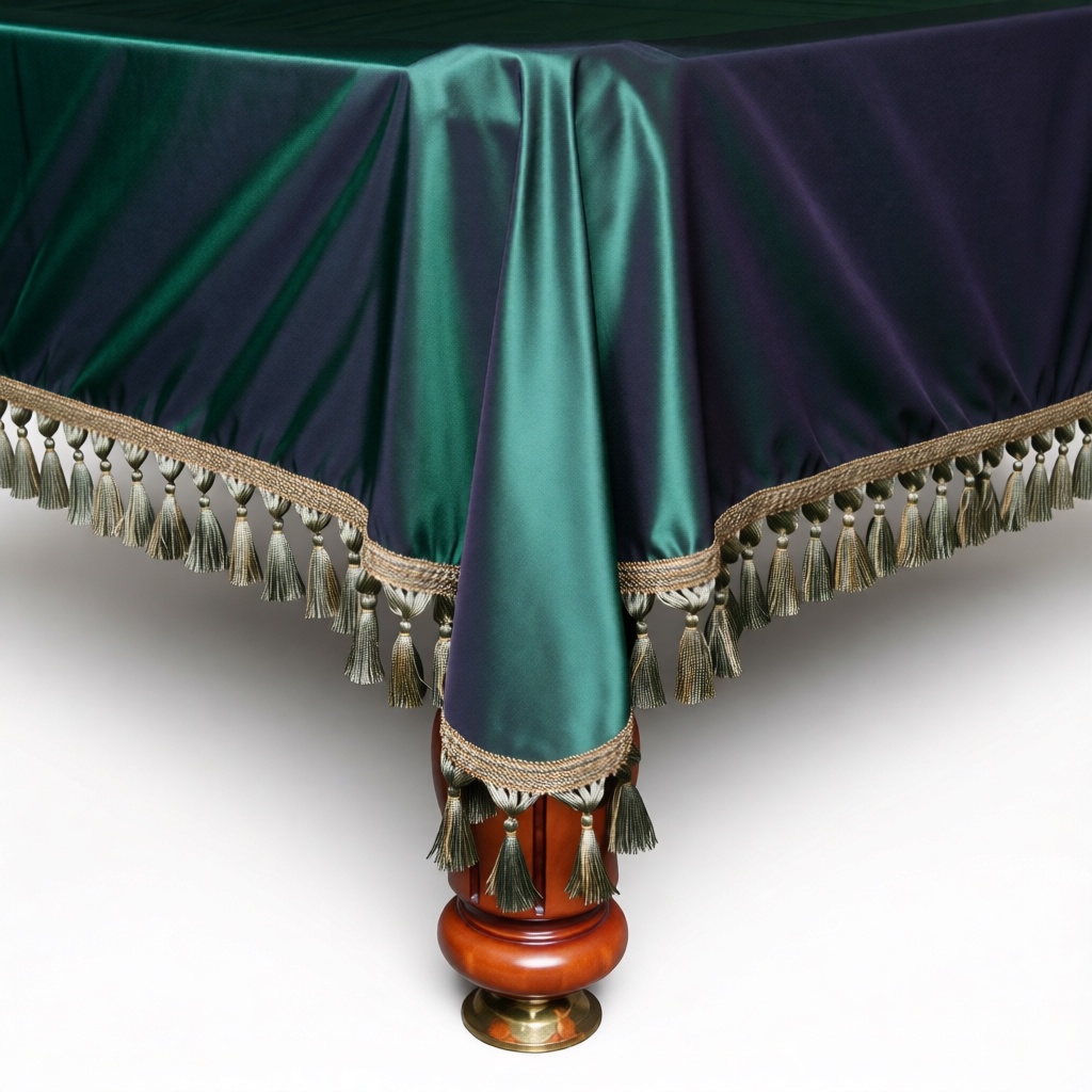Это покрывало относится к продукции премиум-класса. Оно выполнено из натурального шелка насыщенного тёмно-зелёного цвета – благородного, глубокого оттенка, который придаёт интерьеру бильярдной атмосферу роскоши и аристократизма. Края изделия украшены изысканными античными кистями (бахромой), что подчёркивает его эксклюзивность.