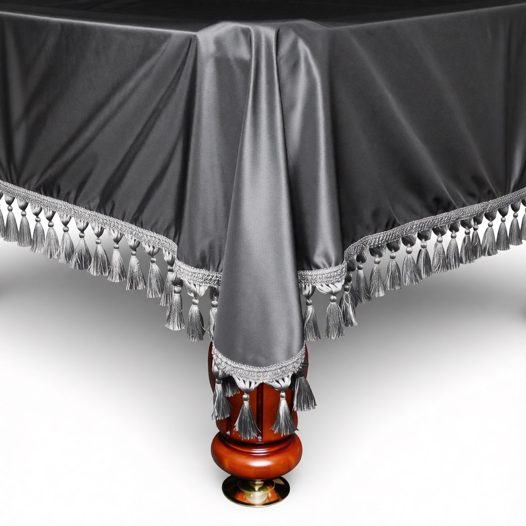 Это покрывало из благородного шёлка серебристого цвета относится к продукции премиум-класса. Ткань имеет мягкий переливающийся блеск, напоминающий холодное сияние металла, что придаёт интерьеру бильярдной оттенок сдержанной роскоши и современной элегантности. Края изделия украшены изысканными античными кистями, которые подчёркивают его высокий статус.